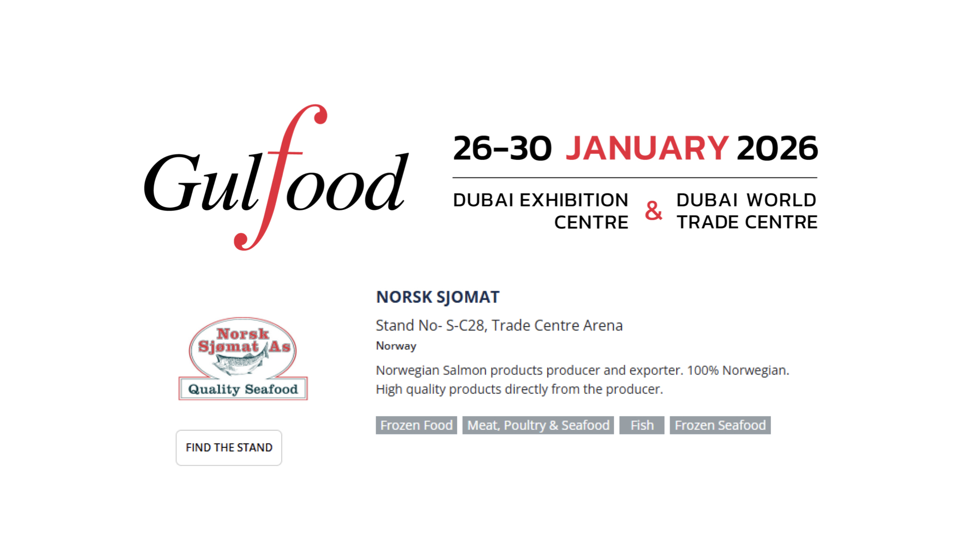 We’re excited to announce that Norsk Sjømat will once again be exhibiting at Gulfood 2026, the world’s largest food & beverage trade show in Dubai.